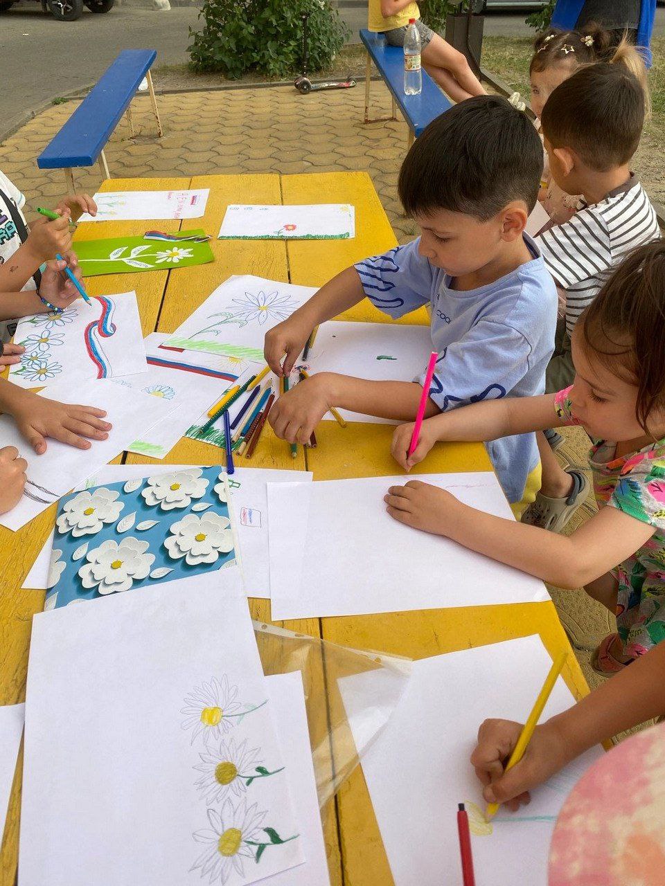 Вожатые молодежного центра «Трамплин» учили ребят постарше делать ромашки, а малыши выводили цветочные лепестки на бумаге и асфальте. Не обходится без настольных и вожатских игр: ребята играют в уно, шахматы, шашки, лягушку, игры-угадайки, горячо-холодно. Дети прыгают на скакалках, создают своими руками открытки.