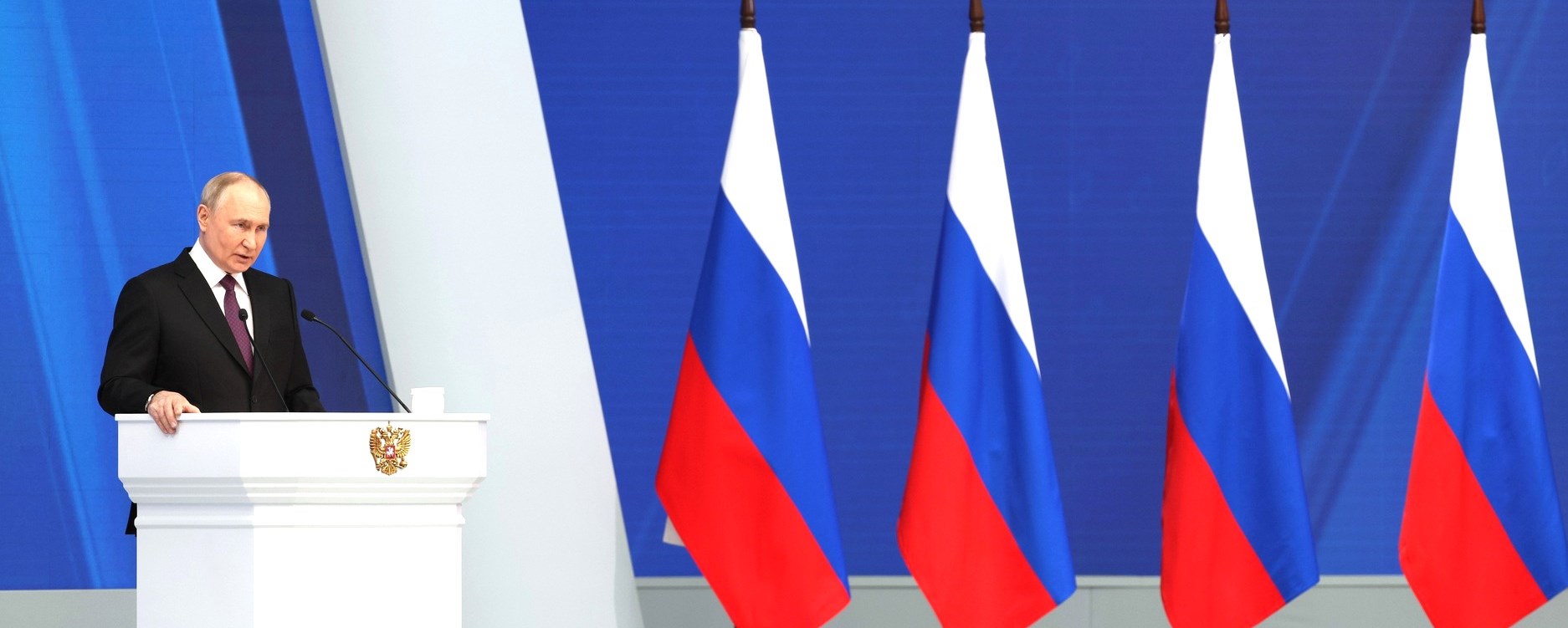 — Каждое Послание Федеральному Собранию – это прежде всего взгляд в будущее. И сегодня речь пойдёт не только о наших ближайших планах, но и о стратегических задачах, о тех вопросах, решение которых считаю принципиально важным для уверенного, долгосрочного развития страны. Такая программа действий, конкретных мер во многом формировалась и в ходе поездок в регионы, прямого разговора с рабочими, инженерами гражданских и оборонных заводов, с врачами, учителями, учёными, волонтёрами, предпринимателями, с многодетными семьями, с нашими героями-фронтовиками, добровольцами, солдатами и офицерами Вооружённых Сил России, — отметил в начале послания Владимир Путин.